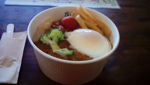 フルーツカレー(税込み550円)とかぐや姫パフェ(税込み450円)を食べました。 カレーソースにからさやスパイスの香りは全くなく、食後に口の中が粘つく感じもありません。また、黄身がとろけ出る目玉焼き、フライドポテト、ミニトマトがトッピングされているので、小さな子どもの舌にも合うでしょう。