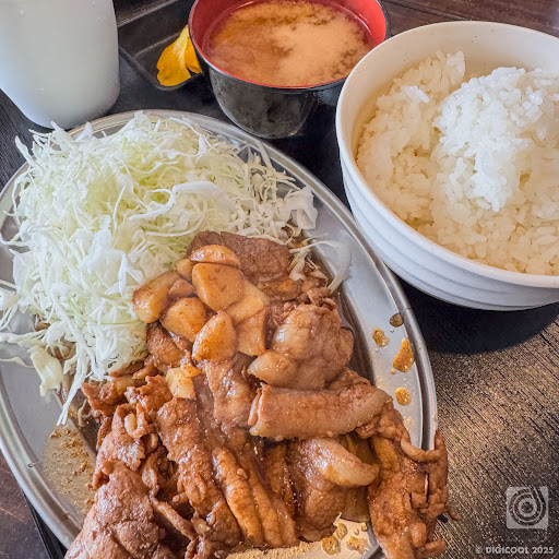 味に関しては、豚バラ肉とカットしたニンニクに、東海民族の基本、2種類のソースをブレンドし、肉体労働者のサプリメントであるタップリのニンニクペーストを投入したソース味のタレを掛けた焼肉に、トンテキと同じくキャベツの千切りをドカンと添えたワンプレート。 酸味のあるソースタレで、キャベツですら白米がバクバク食べれる。