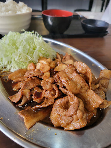 今では四日市の名物といわれるようになった「四日市トンテキ」のルーツともいわれているのが「四日市やきにく」ということらしいです。 トンテキとの違いはトンテキがグローブ上にカットされた厚切りの豚肩ロースなのに対して、四日市やきにくは同じ豚肩ロースでも薄切りにされたものを使用しているのが特徴。タレは比較的似ているけどトンテキの少し煮詰まったようなこってり感はないかな。それでも大量のにんにくが入っていてスタミナ満点なガッツリ系定食です。 キャベツやご飯との相性はこっちのほうがいいように思えます。タレの染みた、少しクタッとしたキャベツが美味しいんですよね〜。