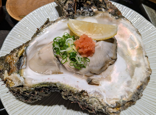 岩牡蠣は生でいただきました。 (焼き、蒸し、生の3種類から選べます。) 肉厚プリプリで濃厚。こんな大きな岩牡蠣はなかなか食べられないのでは…??