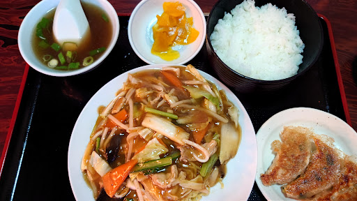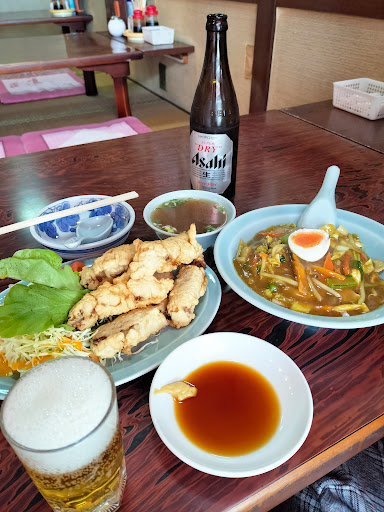 日課になっている、通勤帰路の冨田駅方面へのウォーキングの途中、1号線から少し奥まった場所にあるこのお店、だいぶ前に気づいてから、その町中華感が満載な佇まいには、かなり気になっていました。 普段は夕方まだほんのり明るい時間帯に通りかかることもあり、外見からは正直営業してるのか否か判然とせず、二の足を踏んでおりました(勇気がなくてスミマセン)。 この日は仕事がいつもよりちょっと遅くなったため、すっかり暗くなっています、そんな中浮かび上がる光に包まれたお店!!( ̄□ ̄)!! 確実に営業している、という謎の安心感とともに足が自然と向かっていました。お店に入ると20時前ということもあり、他にお客さんはいません。ご主人と奥様のお二人で営業されておりました。 いつもなら、初到達のお店はラーメン&チャーハンで攻めるところ、事前のクチコミ調べにより、天津飯と、評価の高い焼き餃子をチョイス!フライパンでガチャガチャ炒める音が店内に心地よく響きます。いい、この音! ほどなく、餃子→天津飯→スープの順に出てきました。いや~、美味しそうです。餃子はニラかな?色合いが少し緑色強めなのが特徴的です。1皿に6個も入っているので、そのまま、タレつけて、天津飯とともに、スープとともに、・・・などなど、いろんな食べ方を楽しみました。お肉感はやや少ない印象ですが、その分さっぱりしてて、いくつでも食べたくなる、食べられる味わいで美味しかったです。これで390円ならお値打ちです♪ 天津飯は色は濃い目ですが見た目とは裏腹に味付けは濃すぎずホントにちょうど良かったです。よくある、卵をふんわり大きくして覆う感じではなく、それよりは少ししっかり火をいれた薄目の卵焼きとキノコなど他の具材も含めたその上から、甘めの餡がたっぷりかかっています。なんだろう、こちらもしつこくなくいつまでも食べられる感じで、ボリューム満点なんですが、でも気づいたらなくなってました(笑)付け合わせのスープは普通ですが、ややあっさり目のやさしい味で、天津飯によく合います。 こちらも780円とお値打ちです。昨今、お店によってはラーメン一杯1,200円なんてところもあるなか、同じ値段で二品楽しめて、非常に満足です。 店内には、材料高を嘆く張り紙もあった(しまった、撮るのを忘れた)んですが、そんな中でもこの値段で頑張っておられるのを見てなんだかとても応援したくなります。でも今日は満腹でこれ以上食べられないんですけども(笑)