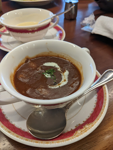 他にも残念だったのは、 サラダのドレッシングが 人数よりも、はるかに少なくて 皆んなで遠慮しながら使っても 足りなかったし、すりおろしの 人参を使って色も綺麗なのですが、こちらも少し塩気が足りなかったとの声がありました。 季節の野菜スープ(さつまいも)が甘くて苦手な私が頂いた赤塩 を皆んなが分け合いました。 あと、最後のアイスコ―ヒ―と アイスティーの、薄かったこと薄かったこと!!あんなに気が抜けた食後のコ―ヒ―は人生初でした。 最大級に残念だったのが、 HPで確認してメニューを 決めて予約したのに、写真の ビ―フシチューが季節の野菜 スープに変わっていたらしく ビ―フシチューは出てこない との事!! 確かにHPにはビ―フシチュー の文字があったし、メニュー選びの決め手がビ―フシチューだったので、 それを店側に伝えると、 お詫びしてくれ、さらに ビ―フシチューも提供してくれたので、助かりました。 でも最近の客はHPで 真っ先に店の情報を得て 訪れますから古い情報は 載せないで欲しいですし、 せめて電話予約した時に、変更の事実を伝えてもらえたら 違うメニューを検討したと思います。 色々ありましたが、昼の部の 営業時間いっぱいまで、仲間と ゆっくりさせてもらえたし、 個室の雰囲気は凄く良いし、 記念撮影のシャッター押しも 快く引き受けてもらえて 気持ち良くなって店を出ました。 ご丁寧に玄関外までお見送り までしてくれましたが、 その方の上着のシャツが ズボンから、はみ出てた (たぶん、この方も昼休み休憩だったのでしょう。) その姿を見て、あの薄すぎる 気の抜けたコ―ヒ―を 連想した事は、言うまでもありません。 これからは、せっかくの 店の雰囲気や柿安の のれんに恥じない 料理と接客サ―ビスの提供を お願いします。 期待の気持ちも込めて 少々辛口ではありましたが コ...