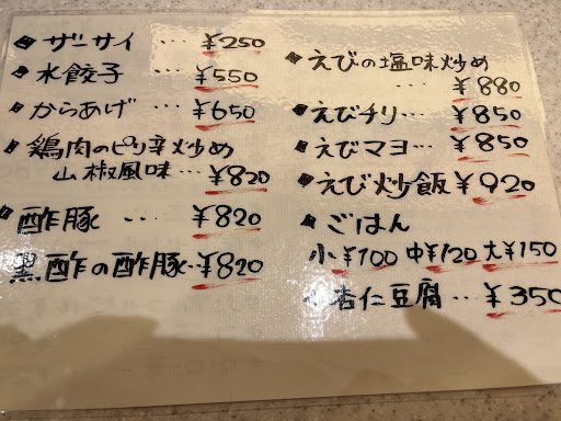 Read moreこちらのお店のえび炒飯が好きで、多いかなと思いながらも、つい坦々麺と一緒に頼んでしまいます。 どのメニューも香辛料がしっかり効いているので、味の好みが分かれます。 坦々麺も麻婆豆腐も、辛さが選べるのがありがたいです。 そして、白飯との相性は抜群です。 移転前と比べ、座席のほとんどがカウンター席になりましたし、ご主人が一人で料理を作っているようなので、さっと食べて帰りたい人には利用は難しいと思いますが、気長に待ちながら料理を楽しむことをオススメします。 店内については、中も外も並んでいるお客さんが多くいますので、静かに黙々と食べている方が多いように感じます。 その為、料理提供後は食べたらすぐに帰る方が多いので、店内でゆっくり過ごしたい場合は他のお店を選ばれた方が良いかと思います。 移転後は、駐車場がパチンコ屋さんと共同になりましたので、車が停めやすく、店内はカウンター席が多いので、男女関係なく1人でも気軽に食べに行けるのが良いなと思いました。 ボックス席はかなり少ないので、少しでも早く食べたい場合は、少人数で来店するか、席はバラバラで利用するのが良いのだろうなという印象です。 待ち時間も多いですし、デートで利用するには少々ハードルが高いと感じますが、気心の知れた友人同士であれば、待ち時間も楽しく過ごせるのではないでしょうか。 そして、こちらのお店の味の虜になる人は、定期的にリピートしてしまうでしょ...