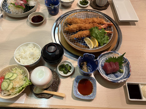 Read more先日刺身が食べたいと思ってGoogleで調べて寄らせていただきました。 行ってみたら精肉店が入ってて間違えたかなあと思いましたが魚と肉のお店なんですね! メニュー見て結構いい値段するなあと思いつつも、エビフライが食べたくなって3本の定食を頼みました。相方は大漁定食を注文。 料理がきてエビフライは大きいし、色々付いててどれも美味しい。 相方の刺身も少しもらいましたがめちゃ美味しかったです。 店員さんもすごく気が効いて明るくとても良いお店でした。 この料理でこの値段なら納得! 近くを通ることがあったらまた寄らせて...