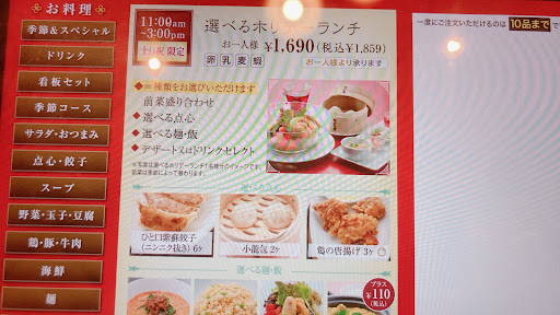 Read moreチェーン店にしては、おいしいランチでした。 前菜は3種類+一口の飲む甘いお酢、おかずは3種類から選べ、海老チーズチリにしました。 ごはんも、ごはんか中華粥か雑穀米?粥から選べ、中華粥にしました。お粥もおいしい! スープは溶き玉子ので、とろみがすごく、おいしいけれど、かなりお腹にたまりました。 そのうえ、杏仁豆腐がつき、しかもすごくおいしい、ミルクプリンみたいでした。 まだドリンクも付き、アイスコーヒーもエスプレッソみたくしっかりした味。相方はホットレモンジンジャーだかにしました、たくさん生姜スライスが入っていて、かなり濃い味だったようです。 これで1380円だかで、安いと思います。 機会があれば、また行きたいです。 お粥とか選べるためか、高...