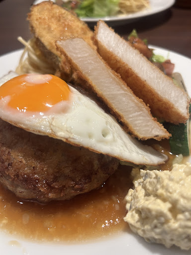 野菜フライも揚げたてでカリッとサクッととても良い食感とお味、付け合わせのサラダもハーブ感のあるドレッシングも相まって美味しかったです。 目玉焼きは少し固すぎる気がしました。もう少し柔らかいと、ハンバーグソースと卵黄を合わせて食べたり楽しめ...
