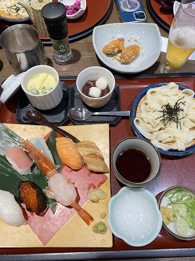 Read more日曜日の夜の7時に訪問 5組待ちでしたが 待ち時間は気にならない程度に席につけました。 私はお寿司とざるきしめん、茶碗蒸しとミニゼザートのセット 相方は鰻丼とざるそば 子どもはサーモンといくら丼 先にビール🍺と手羽先 カリカリの手羽先はいつ食べにきても美味しい 私のお寿司ときしめんは 当たり🎯お値段も手頃で満足 相方の鰻のセットは税込5000円超えでしたが うーん🧐この値段なら鰻屋で食べた方が値打ちかも 今年のいくら丼とサーモンはまずまず いくらも高いもんねーいくらが少ないと子ども 七月は感謝祭があるとのこ...