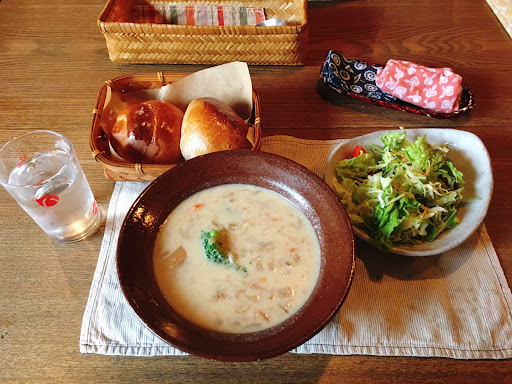 私は野菜のクリームシチュー+焼きたてパンセット、相方は味噌のピザ+サラダセットを注文。