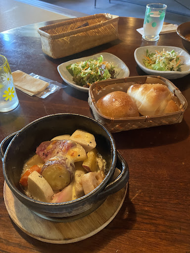 今回は根菜グラタンとパンとサラダのセット1100円を注文しました。 石窯パンというだけあって、パンがふかふかでとっても美味しい! グラタンはサツマイモやレンコンなど根菜がゴロゴロで、グラタンのソース感は少ないです。 身体に優しい味で身に染みます。