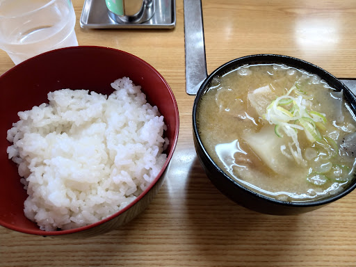 注文はミックス並盛に目玉焼きトッピング。 後、ご飯とお味噌汁(豚汁)。 並盛でも1.5玉有るので女将さんに食べれるか聞かれます。多分ご飯とお味噌汁頼んだからでしょう。