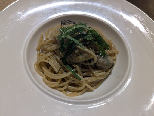 ★牡蠣と大葉のパスタ 平打ち麺に半分に切られた牡蠣がたくさん入り、和風の味付けでした。少しだけ塩辛く感じましたか、バランスは良く美味しかったです。