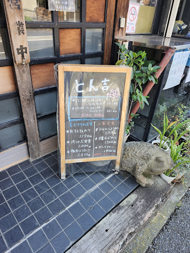 Read more20年程以前にお邪魔した事がある「とん吉」に行って来ました。 入店後、店の女性が気持ち良く出迎えてくれ、1台のみの駐車場に案内してくれました。 店内は良い感じに昭和でした。 僕はロースかつ定食、息子はランチのニンニクとんかつをオーダーしました。 ランチタイムはライス大盛り無料だそうです。 ただライスの大盛りだとかなり量があるので女性ならば普通で十分だと思います。 かつが配膳される前に、自前で擦る白と黒の胡麻がやって来ます。 ここの胡麻は香り高くとても芳ばしい味と香りがします。 主役のロースかつが来ました。 ¥1350の定食にしては大きく分厚い。 一口食べて見る。ジューシーでかなりしっかりした味がします。 大当たりの定食でした。 ニンニクとんかつは肉をニンニクに浸け込んだようで、かなりニンニクの味と香りがして、美味しいです。 味噌汁は赤だしの蜆汁で、懐かしい味を楽しみました。 レビューには接客に問題があると書かれていますが、そう言う人は一度自分の客としての店側との接し方を考えた方が良いのでは無いでしょうか⁉️ 店側だって楽しく食事をして戴きたいと思って仕事にしているのだから、お互い敬意をもって接すれば、美味しく楽しい次回を...