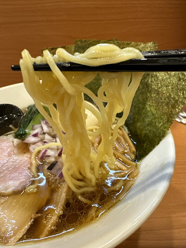 麺は細く軽い縮れ。 やや黄色みを帯び、イメージされる醤油ラーメンのビジュアルを体現化 モチモチした食感で、バツっとした歯切れは無く好みの別れるところか?と思うがスープには良く合っていた。