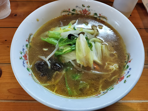 マップで、自宅近所を「ラーメン」で検索して見つけたお店です。 土曜日の12:15頃訪問で前客5名後客なしです。 店内に入ると少し暗めですが、厨房のご夫婦が暖かく迎えて下さいます。 壁に貼られたメニューを見て「醤油ラーメン」を「大盛」で口頭注文します。 前客全員が未提供なので待ちを覚悟しましたが、それほど時間は掛からずに提供されました。 見た目で麺量が多そう、デフォで半ゆで玉が載っています。 まずはスープから、あっさりした醤油味、複雑な出汁感も感じますが、濃い味に慣れた私には若干薄いかな、でも丁寧に調理された美味しさは感じられます。 麺は縮れ細麺で啜り心地は良いのですが、加水多めのツルっとした感じでスープが絡みません。 叉焼も小さく薄く、メンマも特に特徴なく...