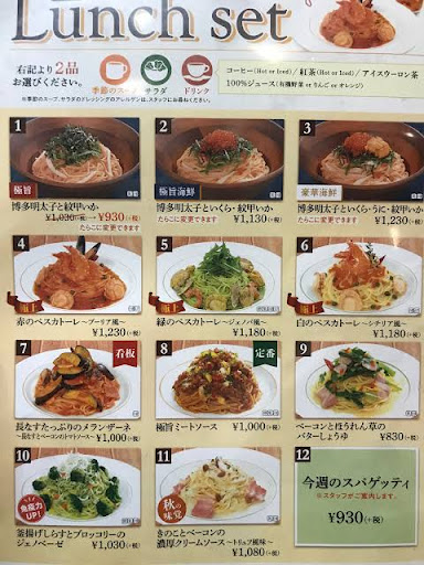 Read more平日ランチ12時前に訪問しました。予約なしでも大丈夫かなと入店しましたが、まぁまぁ席は埋まってました。平日でもなかなかの人気でびっくりしました。ランチはお得にスープ、サラダ、ドリンクから二種類と🍝のセットです。季節限定の🍝から王道のものまで選びがいありました。えび明太子クリームランチスープサラダセット税込1150円のランチを頂きました。サラダはレタスだけとシンプル。スープがかぼちゃスープでとてもおいしかったのですがサイズがエスプレッソサイズのコップでびっくり~。スープの写真掲載したほうがいいのでは?でもとても濃厚で季節を感じることができてよかったです。パスタはクリームたっぷり、そしてたまにピリッと!明太子の味が。パスタはなかなかの量でした。満足感は高いです。ジョイナステラスのポイントカード、駐車場も1000円以上で2時間サー...