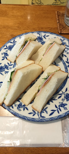 ハムサンドでレモンティーのホットにしたが、サンドイッチはハムの他にきゅうりも入ってた。きゅうりはシャキシャキで美味しい。パンは弾力強め