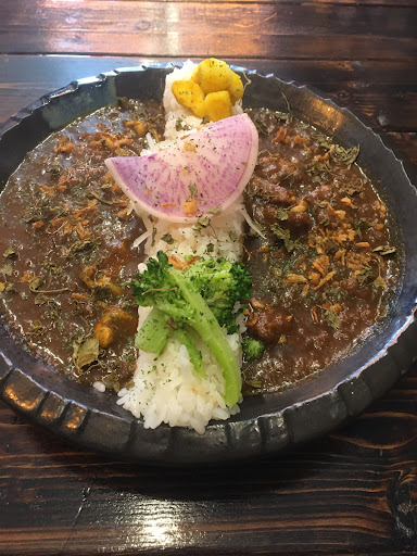 ・「茄子とそら豆の牛キーマカレー」は、まろやかな口当たりと野菜の旨味が茄子とそら豆からたっぷりです。そこに甘みとコク深スパイスが調和して、牛キーマでもしつこさを感じずにスプーンが進みました。はじめて感じる感覚にワクワクしました。