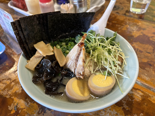相変わらず車は止めづらい(笑)でも、止めらられるだけマシかな🤣 車を止めた瞬間から匂ってくる豚骨臭😅 さぞご近所には辛いであろう。 しかし、豚骨ラーメンを食べにきた者には最高に期待ができる匂いだ。 中に入ると外で嗅いだ匂いがまるで嘘の様にしない😆 入り口のカウンターで食券を買うことになるのだがいまいちメニューが分からない。 壁を見るとメニューが書いてありそこから選ぶことになるのだが、食い意地を張ってしまい全部のせにしてもうた😅 結果、全部乗せはお勧めできない。なぜなら具材を食べてるうちに麺が伸びてしまうからだ😅 しかし、もちろん全部乗せの具材はすべて美味しいと言う事は付け加えておこう。 ここのお店の良いところは本日のスープの出来栄えを示してるところ。本日の出来栄えは良いだった👍 外の臭いに反してスープは臭みがなく、それでいて福岡の豚骨ラーメン以上に本格的な豚骨ラーメンに仕上がっている。 現状、福岡の博多ラーメンも時代が変わり臭みがなくなりつつ紅生姜や高菜を置いてるみせが減ってる。 こちらでは卓上に胡麻、ニンニク、紅生姜、その他が常備してあり本番以上の豚骨ラーメンを楽しむことができる。