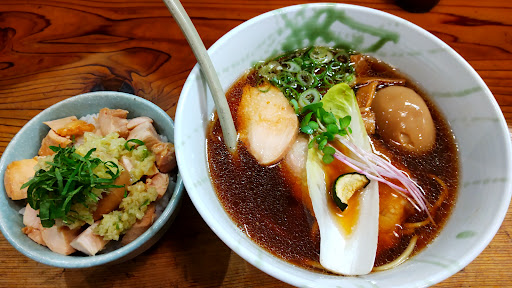 らーめん正油980円+味玉100円、ネギしょうがダレ玉子丼400円。麺はモチっとツルっと美味い自家製麺。スープは、醤油感先行後、節系の出汁が追い掛けて来る。油の重さを抑えた、さっぱり食える一杯。ちなみに白菜、茄子、カイワレはデフォで乗ってました。味玉は程好い味加減。丼は、鶏胸肉を軽く炙り、えぐ味を落とした生姜の微塵切りを、優しい塩加減でのせて、味玉を配したもの。六ツ川は老人と子供連れが多い立地なので、メニューや店内設備にも気遣いが感じられる。家族連れokの貴重な一店。 20...