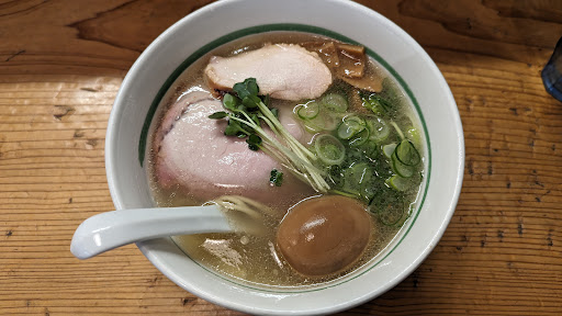 Read more仕事の合間にふらっと寄ったこちらのお店 塩ラーメンを頂きました。 結論から言うと非常にクオリティの高い淡麗系ラーメンで是非一度は食して頂きたいです。 塩ラーメン+味玉でピッタリ1000円 スープは少しの濁りはあるもののエグ味は全くなく喉が喜ぶコクと後味。 最初に食べたチャーシューは柔らかと肉のジューシーさが両立されていて豚と鶏ハム共にラーメンの邪魔をせず、でもしっかり際だった旨さがあります。 葱やかいわれも鮮度が良いのか歯ごたえがありつつ臭み全くを感じませんでした。 次に味玉ですが、箸でつまんでぷよぷよさせれる半熟具合、中の濃い黄身としっかりと漬け込まれたシミシミの白身がラーメンの良いアクセントになってくれました。 また自家製麺(お話出来なかったので違ったらすみません。)がコシがありスープめちゃくちゃ美味しかったぁ。 1つ1つの質が保たれたままバランスよくまとまっている、人を選ばずにオススメ出来るラーメンです。 立地の関係か土曜日のお昼頃でも空いていました。 テーブル席もあるので家族連れでも安心してゆっくり食べられると思います。