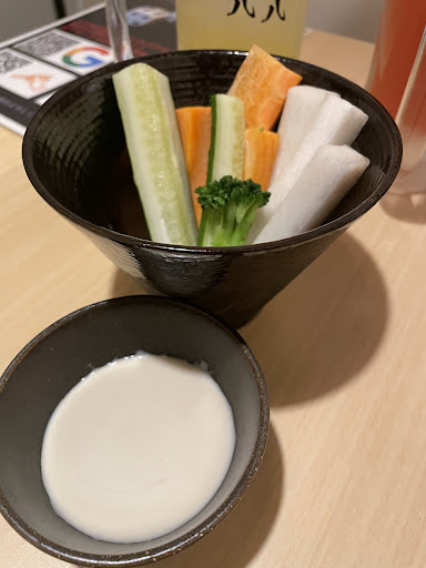 ⇩レビュー⇩ ◼️お通し(野菜スティックとバーニャカウダソース) お通しとして出されたのは大根、にんじん、きゅうり、ブロッコリー、プチトマトの野菜スティック!野菜が新鮮シャキシャキ、アンチョビのきいたバーニャカウダが美味しい。 しかもこちら食べ放題というのでびっくり!