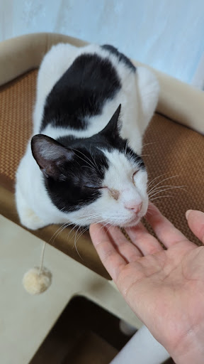 Read more車でお邪魔しました。うちの車はワンボックスなので何度か切り返して駐車してくれてました。(自分は乗ってるだけなもので) 予約しておくと駐車場もあるので1台停めさせてもらえます。仕事が16時までなので、今まで行けなかったのですが、今月からかな?夜まで営業してくれるようになったので、仕事後に初めて行けました。 一部屋にネコちゃんが5匹いたかと思うのですが、おねむちゃんは基本ずっとお尻向けて寝てました…(-_-)zzzお邪魔はしないよう、他の子をナデナデしてました。が、おやつ来たらむくっと起きました。かわいい(^^) 姫様のようなミケちゃん(いまりちゃん)とよもぎくんがよく撫で...