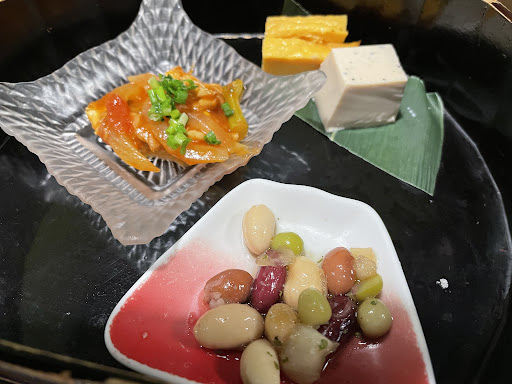 ・お通し 550円 お通しはブロッコリーのトマトクリーム煮、焼かないだし巻き玉子、熟成酒粕の卵焼き、黒ごまとコーヒーのミルク寄せ、タスマニアサーモンのスモークコンフィの5種類の盛り合わせでした。 どれも創作系のメニューで初めて食べるような味わいでした。 特に黒ごまとコーヒーのミルク寄せは意外なな組み合わせでしたが、黒ごまとコクとコーヒーのほろ苦さマッチしてました。 また、酒粕の卵焼きは甘くて濃厚で美味しかったです。
