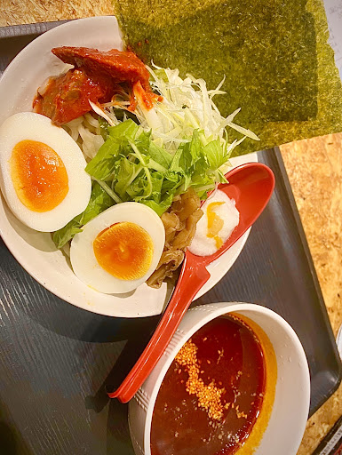 「赤唐つけ麺」は病みつきになる旨さ。 最初は辛いつけ麺かーと食べ始めたのだが、 ここは元のスープの出汁の取り方が丁寧。 辛さの中に海鮮の昆布やあさりの優しいウマミがあるから箸が止まらない! とろろとゆずを少しずつ混ぜればさらにバランスが良くなり、気づいたら完食、そして替え玉注文(笑) シメにはあさりの風味がたまらないスープ割を頼める。そしてスープも完食(笑)