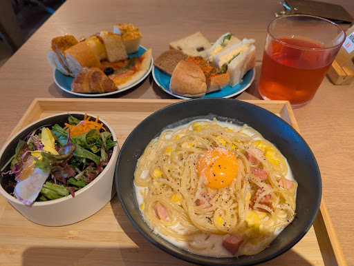 Read more開店直後に伺いました。焼きトウモロコシの濃厚カルボナーラとミニサラダ、パンの食べ放題がついているものにしました。パンは明太子フランスやたまごサンドイッチ、カレーパン、ピザ、フレンチトースト、チュロスなど他にはないような、普通にパン屋さんに並んでいるような惣菜パンがあり小さくカットされていて選ぶのも楽しいです。ただ、サンドイッチやフレンチトーストはパンもふわふわなのに比べてカレーパン(結構スパイスはちゃんときいてるカレーでした)やソーセージパンなどの惣菜パンのパンはパサパサで昨日の残り物感が否めなかったです。トースターも1台置いてありましたが、他のお客様もいたり、待っているのも気まずく、店員さんもうろうろしているのでなかなか使いずらいです。飲み物も飲み放題のものがありましたが、デトックスウォーターのようなものや、アサイーウォーターなど水に少し香りがついた程度のもの4...