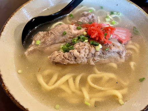 Read more沖縄より帰ってきてそーいえばソーキ食べてなかった!どーしても食べたい!と思いランチで訪問。早速ソーキそばのじゅーしーセットを注文しました。お値段は950円。テーブルにはコーレグースも置いてありこれはなかなか期待出来るなと思いつつ待つ事5分位で着丼です。 まず麺はやっぱり沖縄となんか違うなぁと思ったのが第一印象。こっち仕様なのかな?次に期待していたソーキなのですがちょっと煮込みが足りない気がします。ソーキの軟骨が煮込むとトロトロになるのですがコリコリであきらかに煮込みが足りないと感じました。あと量が少ない。肉肉しい感じが欲しかったので物足りなさを感じました。そしてスープは魚感が少なく出汁のパンチが足りない様に思います。じゅーしーは美味しかったです。夜は色々メニューがあって美味しいよと知人より聴きました。 なかなか近くに沖縄そばを食べさして頂けるお店が少ない為今後の期待を込めて星3つとしました...