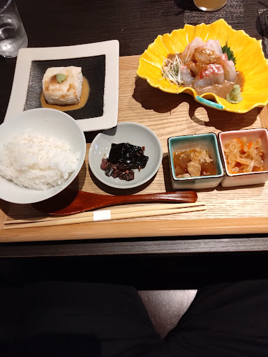 一本勝負のランチメニューは「鯛茶漬けセット」で、焼き胡麻豆冨、小鉢2種、香のものが付いて、ご飯はおかわり自由でした。最初は胡麻ダレで鯛の刺身、小鉢、香のものをおかずに、炊きたての美味しく炊けたご飯で頂き、ご飯をおかわりして、胡麻ダレに付けた鯛の刺身をご飯に乗せて、土瓶に入ったあつあつのお出汁を掛けて、お茶漬けサラサラで美味しく頂きました。 焼き胡麻豆冨は、見た目が焼き餅のようで、箸を入れもお餅のように伸びて不思議な食感でしたが、とても美味しかったです。 2つの小鉢も上品な優しいお味で、昆布の煮ものも美味しかったです。 ランチタイムから店主のうち田さんが修行で会得した青山の旅亭の味を堪能させて頂き、高級感のあるランチタイムを過ごさせて頂きました。
