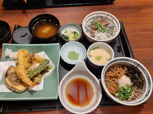 巴御膳の佐賀牛の丼は写真とちょっと違うかな?空き地が目立ちます 天ぷらは少し揚げ過ぎ感があり、海老は丁度良いのですがインゲンやオクラは苦みがあります お蕎麦は相変わらず美味しい♪梅と大根おろしでサッパリといただけます。 茶碗蒸しもトロっとした仕上がりで外せません! 妻のお寿司は、一見普通ですがネタは少し大きめで満足しているようでした。 ややワサビが刺激的だったようで涙ぐむシーンも!