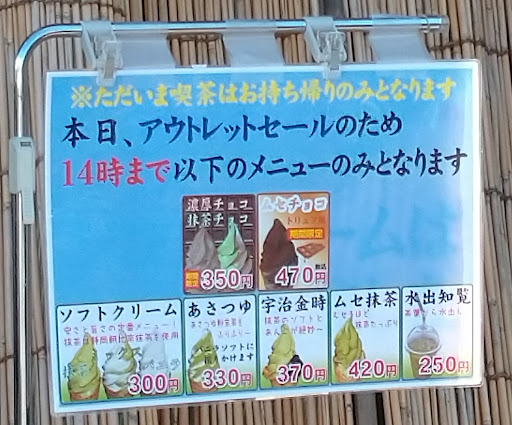 Read more毎月第四土曜日に横浜mdcによるアウトレットセールを利用した際に、出店していたことで初めて知りました。 新型コロナの影響で久々になってしまいましたが、2021年10月23日に再訪しました。 以前利用した時と違って、出入口を一ヶ所に変更し、入店人数を制限しておりました。 今回はむせ抹茶のソフトクリーム(¥420)をいただきましたが、抹茶の味をしっかりと味わえました。 また、食べている最中に一度むせてしまいました。 食べる場所は、このご時世の影響で屋外だったので、風が吹いた時に抹茶の粉末が少々手に落ちました。 茶葉や粉末のお茶、お菓子など色々と取り扱われております。 レジが一ヶ所なので、今回のようなアウトレットセールの日には会計の時に列ができます。 2023年10月12日に再訪して、季節限定の和栗のモンブランをトッピングでのせたソフトクリームをいただきました。 栗の香りをしっかりと味わえました。 2024年8月3日に再訪して、エスプーマ泡抹茶ソフト(¥550)をいただきました。 バニラアイスのソフトクリームを覆うように泡抹茶のクリームが乗ってましたが、泡抹茶のクリームは甘味があまりないため、中のソフトクリームも一緒に取りながら食べる必要がございます。 茶色い粒は玄米でカリッと...