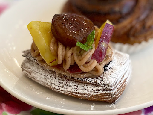 デニッシュ生地が美味しいと伺ったので、モンブランミニデニッシュを注文しましたが、まぁパリッパリ。めちゃくちゃ美味しい。 モンブランクリームも、ミニを頼んだのに、意味がわからないほどのっており、重量系(笑)嬉しすぎます。 重たくなりすぎないようにするためか、ブルーベリーのコンフィチュールが入っているのもいい。