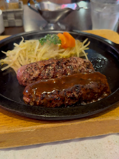 ビーフ100%のハンバーグは半分に切られた 俵型で熱々の鉄板に乗せて提供されます。 ミディアムレアで注文しましたが、切ってみると中々レア? 鉄板が熱いうちにお好みの焼き加減にして 塩胡椒や自家製ソースでいただきます。