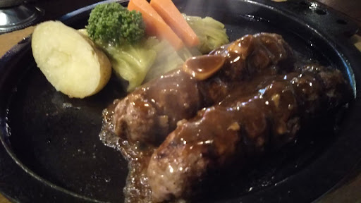 ハンバーグは240gだと細長い俵型が2個。付け合わせは焼き野菜(じゃが芋、人参、キャベツ)。鉄板はかなり早い段階で鎮火(?)する。ナイフを通すと……切れない! 固いのではない。潰れるのだ。自分はしっかり切れるのが好きなんだけど、それはそれとして味はgood!