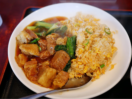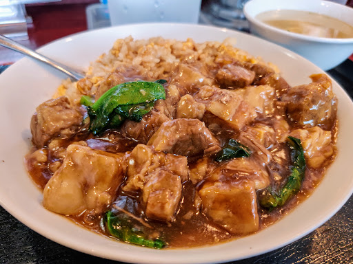 メニューを見ると美味しそうな料理が沢山並んでいる。今日は牛バラチャーハン(スープ付き)と餃子と杏仁豆腐を注文。牛バラチャーハンはボリュームたっぷりで牛バラがゴロゴロ入った餡がチャーハンにかけてあり、とても食欲をそそる見た目。餡は甘めの味付けで、牛バラはとっても柔らか。チャーハンは濃すぎない味付けで、牛バラ餡にとても合う。餃子は具のシャキシャキ感が残っていて少しだけニンニクが強め。サイズは普通で凝った食材は使って無さそうだが、シンプルな好みの味でかなり美味しい部類の餃子だと思う。餃子定食みたいなものでもあれば、餃子のみを大量に味わってみたいところ。