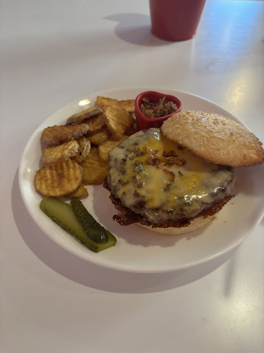 Retro American diner with superhero memorabilia serving hearty burgers, finger foods & shakes.