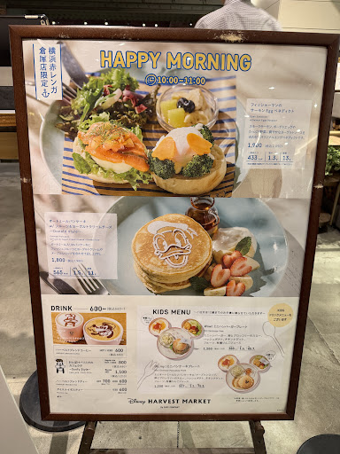Cute, aesthetic, and surprisingly spacious—but overpriced drinks and limited menu options hold it back. We visited Disney Harvest Market at the Yokohama Red Brick Warehouse, and while we arrived right at opening, it was already buzzing. The café is located on the 3rd floor of Building No. 2, which you access via escalator or elevator. The vibe is rustic-meets-Disney, with exposed red brick walls and seasonal displays—including a giant Mickey statue perfect for photos. This location opened in Dec 2022, as part of the Red Brick Warehouse’s major renovation, which added 25 new stores. We stumbled upon it after seeing an ad downstairs and decided to check it out with our group of six—no reservation, and they seated us right away. The afternoon tea set looked adorable—tiered trays, Mickey-themed bites, and pastel drinks—but we didn’t order it. Heads-up: everyone at the table is required to order a drink, which felt a bit forced. Not everyone wanted one, but I went with the green smoothie, which was actually delicious and came with a mint garnish. The matcha latte had Goofy art in the foam, which was a fun surprise. Prices were on the high side: Green smoothie: ~¥850 Matcha latte: ~¥800 Kids set (oatmeal pancakes): ¥1,200 All served on Mickey-shaped plates with ears—very aesthetic and kid-friendly. Only downside: no bathrooms inside the restaurant. You have to walk across the building or go downstairs, which isn’t ideal with kids or during busy hours. If you’re into Disney, cute plating, and waterfront vibes, this place is worth a visit—especially for the photo ops and seasonal displays. But the menu is limited, and the drink policy feels overpriced for what you get. Still, the staff were friendly, and the ambiance was cozy and photogenic. Would I go again? Maybe—with a friend to split the...