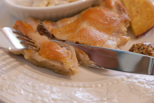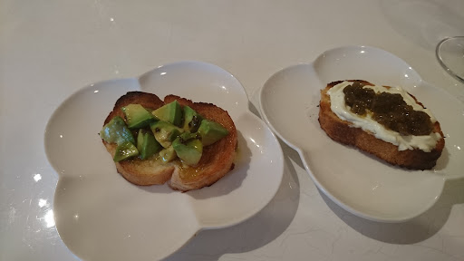 冷静コンスープ、ブルスケッタ、ジュレ、 パン、パスタ、どれも薄味で旨味もなく、残念なお味でした。鶏のコンフィは柔らかいものの、塩味が強く鶏の風味も消されてしまってこれも、旨味もありません。 最後のチーズケーキも他のケーキ屋とは 違うとアピールしていましたが、言うほど普通でした。