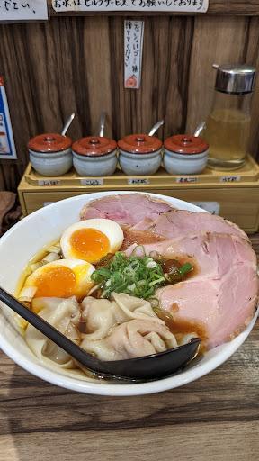 トッピングのチャーシュー、ワンタン、味玉はどれもクオリティが高くめちゃくちゃおいしい❗卓上調味料がなくても、トッピングだけでこの一杯を満喫できますね。