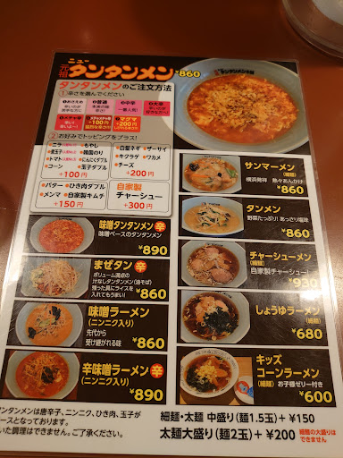 Read more12時少し前に入店しました。 席はカウンター、テーブル、小上がりがありました。 1人のお客さんはカウンターで、2人以上はテーブルか小上がりに通していました。 席に座り置いてあったメニューを見て、タンタンメンの中辛で、トッピングのひき肉170円と玉子170円をどちらもダブルで注文しました。 一緒にいった友人は、タンタンメン970円の中辛で、トッピングのニラ、白髪ネギ、チャーシュー、ニュータンタン餃子焼き(5個)540円を注文しました。