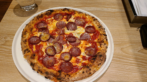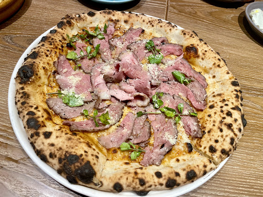 さらに、ピッツァにはルッコラがトッピングされており、シャキっとした食感とほのかな苦味が、ビーフとチーズのリッチさを引き立てます。ルッコラのフレッシュさが加わることで、ピッツァが重くなりすぎず、全体のバランスが良くなっているのが嬉しいポイントです。生地の焼き加減も絶妙で、外はカリッと、中はふんわりとした食感が楽しめます。