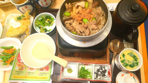 鶏ごぼう釜めしを食べました。 注文を受けてから炊くので、提供までそれなりに時間がかかりますが、固形燃料での加熱もあり最後まで熱々で頂けます。 初めはそのまま、次に薬味を乗せて、最後はお出汁をかけてと楽しめます。 ただ、お出汁が少し塩気が強いと感じました。稀釈の関係かなぁ?