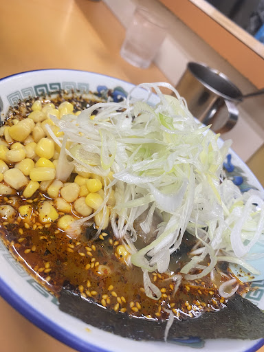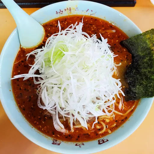 This is spicy ramen. The soup is pork bone-based soy sauce flavored and spiced with chili peppers and other spices.Wakame seaweed and a large amount of finely sliced green onions go well with this ramen.