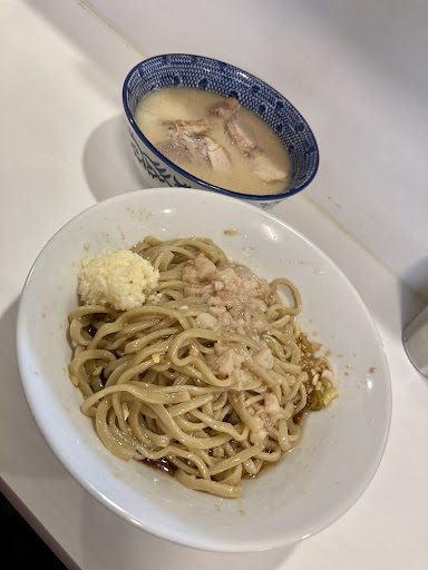 細かく切ったニンニクががっつり入っていました。スタミナつきそう。麺はつけ麺のように太めモチモチでコシがあり(麺硬めにしたからなおさら)、クセになりそうです。