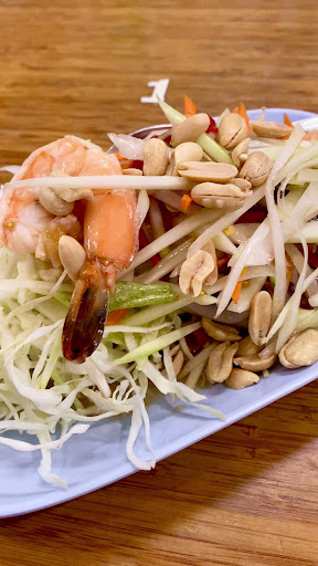イカや海老などのシーフードがたっぷり入ったサラダ。 甘くてシャキシャキなキャベツ、もっとシャキシャキな青パパイヤがたっぷり。