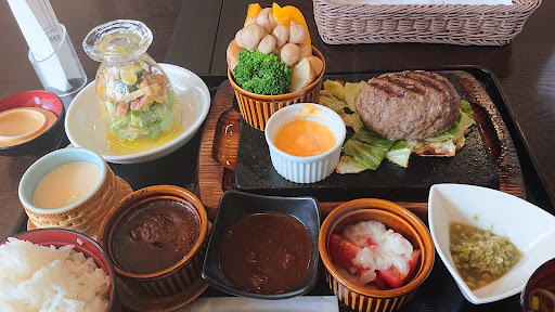 Read more某日某所、歩を進めていると、来店者数を誇示する開放的な外観のチェーン店とは違う、しかし存在感を主張する建物が目に入る。 近くの看板には「食の散歩道 田舎路(いなかじ)」。 時は正午。ふと、今日はまだ何も口にしてなかったなと思い、誘われるが如く足が店へと向かう。 年季の入ったメニューはずしりと重く、焼き魚だ、うな重だ、ステーキだと色彩豊かな写真と品数に目が彷徨う。 そういえば子供の頃、親に外食に連れて行ってもらった時もこんな感じだったなと、在りし日を思い出す。 そんな中、ページをめくっていると目に飛び込んできたのが、この「溶岩石焼ハンバーグセット」。 昔を思い出していたのがいけなかったのだろう。一目見ただけで、このおもちゃ箱に決めてしまった。 しばらくの後、やってきたのは左上から右に、サラダ、野菜のチーズフォンデュ、ハンバーグ、茶碗蒸し、ビーフシチュー、デミグラスソース、トマトサラダ、わさびソース、白米、味噌汁の御一行。 ではお相手仕る、と箸をとるも初手で致命的な失敗を犯す。ブロッコリーをチーズフォンデュにつけたは良いが、根こそぎやられてしまったではないか。 しかして、敗北感と満足感に包まれなが...