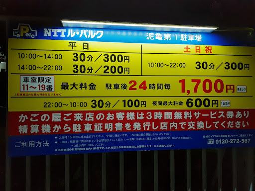 駐車場は少し離れたところにあるNTTルパルク泥亀第1駐車場が使えます。食事をすれば3時間無料になりますが、混雑等を理由に飲食をキャンセルした場合は無料に出来ないようなので注意が必要です。