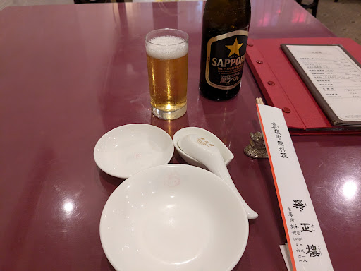 今回、夜に一人で訪問し、やたらと料理を注文しても食べきれないので、前菜と麺のみ注文してみました。注文したのは蒸し鶏、エビとカニのあんかけ焼きそばです。食事のお供に瓶ビールを注文。